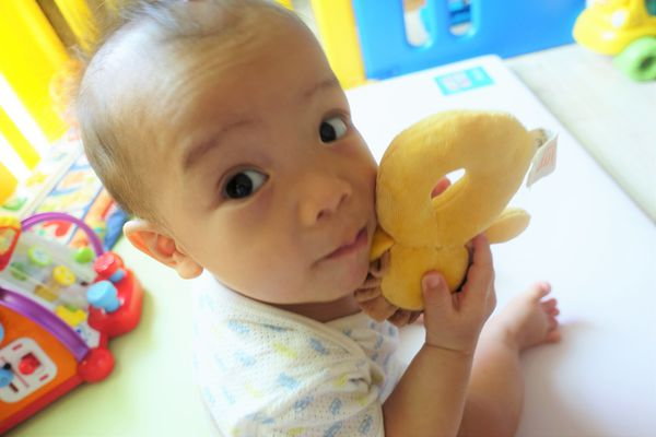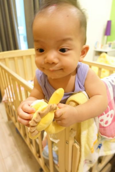 可能是有比建議月齡早一些些給他玩吧,他其實還不會吹氣,只會一直放嘴巴,